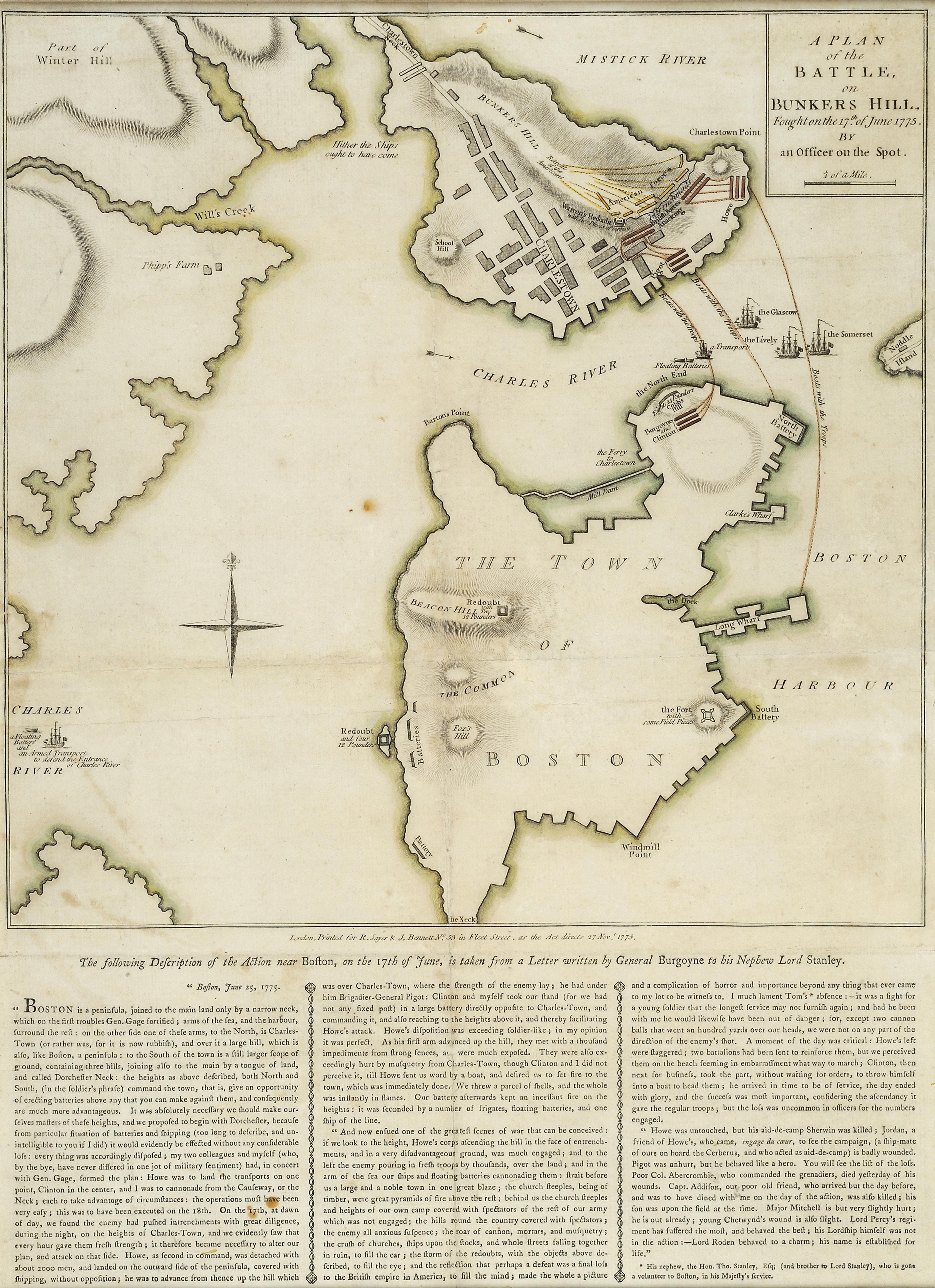 At foot is text in letterpress with caption: "The following description of the action near Boston, on the 17th of June, is taken from a letter written by General Burgoyne to his nephew Lord Stanley": account of the battle, including his following the order to set fire to Charlestown.